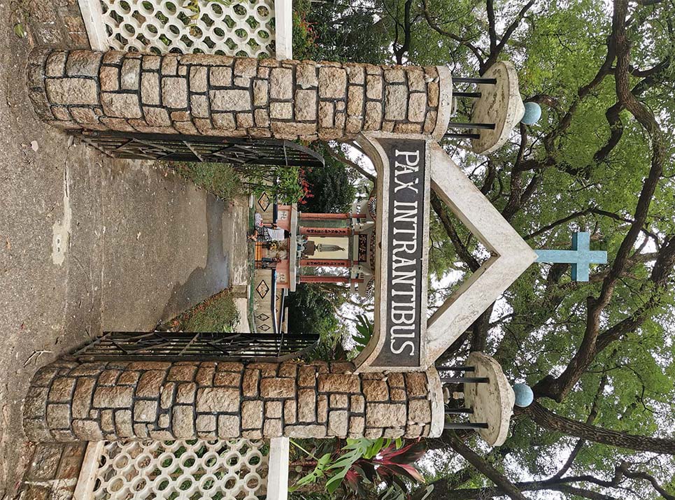 沿步道落石級斜坡往聖母神樂院 -- 建於1950年代初的隐修院,具建築觀賞價值的聖堂及聖母亭小庭園,環境清幽,靜心舒寧。由神樂院至小碼頭沿途,有14棵大樹掛了十字架,上面貼上耶穌不同表情的頭像,是神樂院靜修的苦路,象徵耶穌在耶路撒冷受難時的14站。