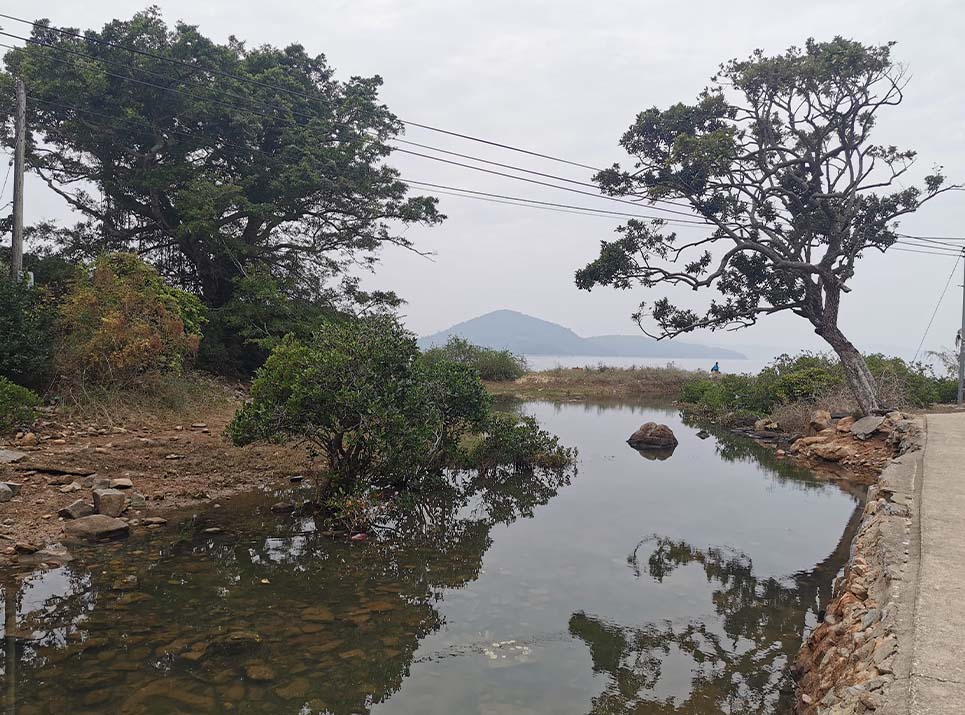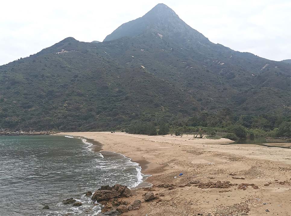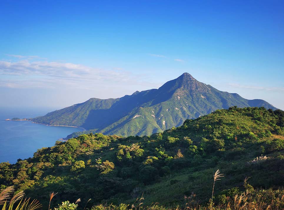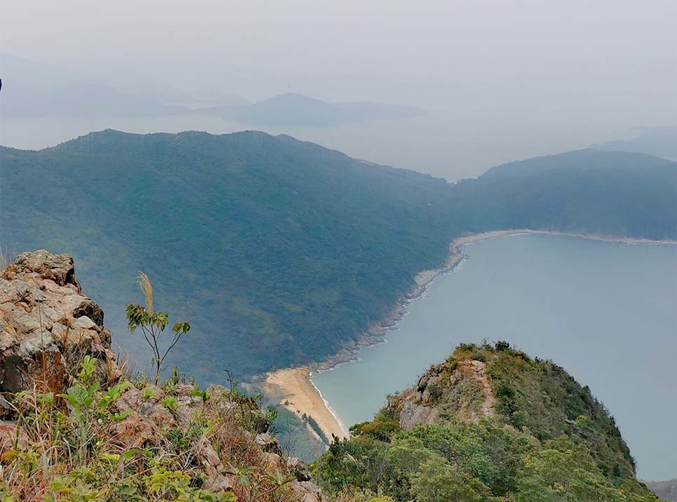 蚺蛇尖雄據西貢東,山巒像大蛇昂首吐舌匍伏在鹹田灣、大灣上,伸延至長咀,風景攝人。