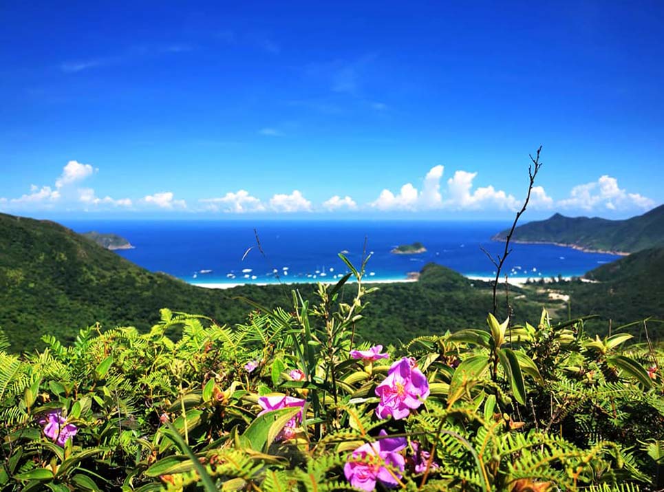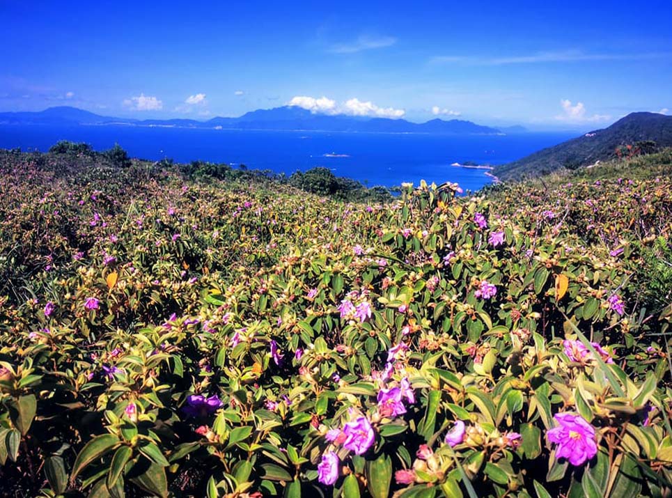 過赤徑上坡大浪坳,到坳小亭左轉離麥徑上小坡往蚺蛇坳方向,到分叉路向左(叉路前是往蚺蛇尖另路不選),上山坡往東龍脊。脊背沿行風景開揚,右邊面仰拔高雄偉的蚺蛇尖,遠眺塔門島及外海的東平洲。夏天七月間整遍山野繁花似錦,嫣紅的野芙蓉爭艷。過東龍脊尾輋落坡,望見康復營方向落大路石徑經蛋家灣出高流灣。