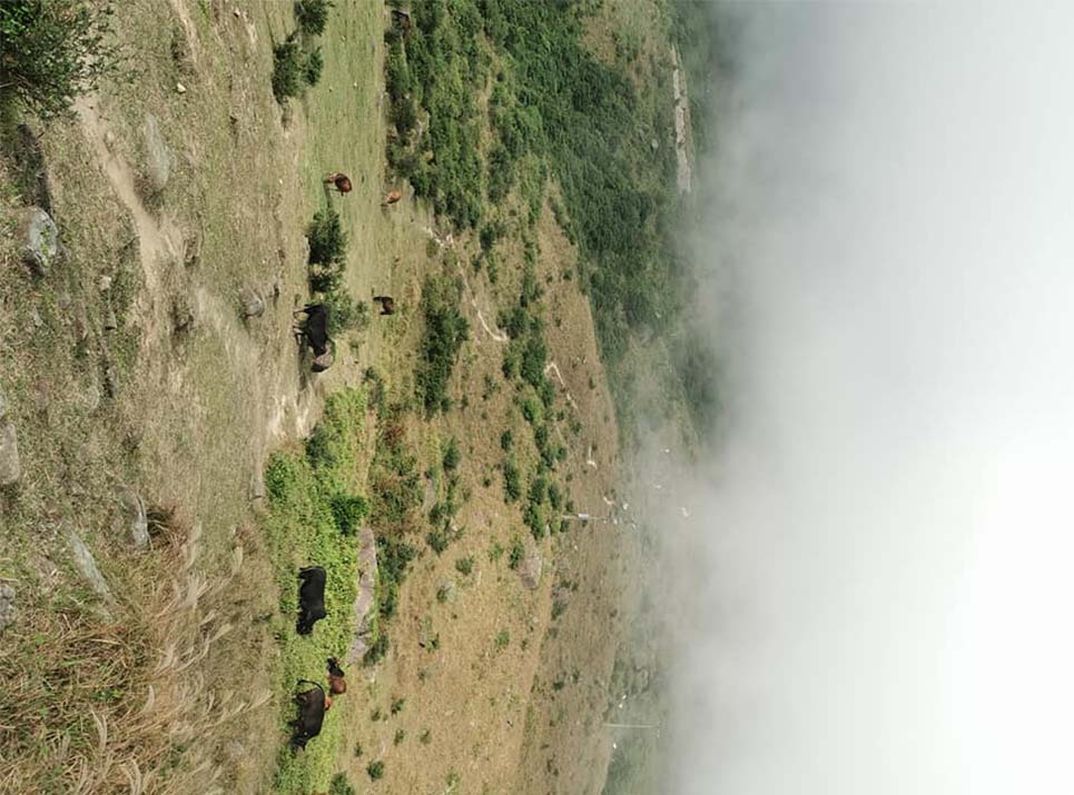 高山四顧,遠望山下繁華城市,妙高台的草坡上牛群悠閒地吃草,芒草在陽光下隨風搖擺,也是在秋意下的另一番景色。