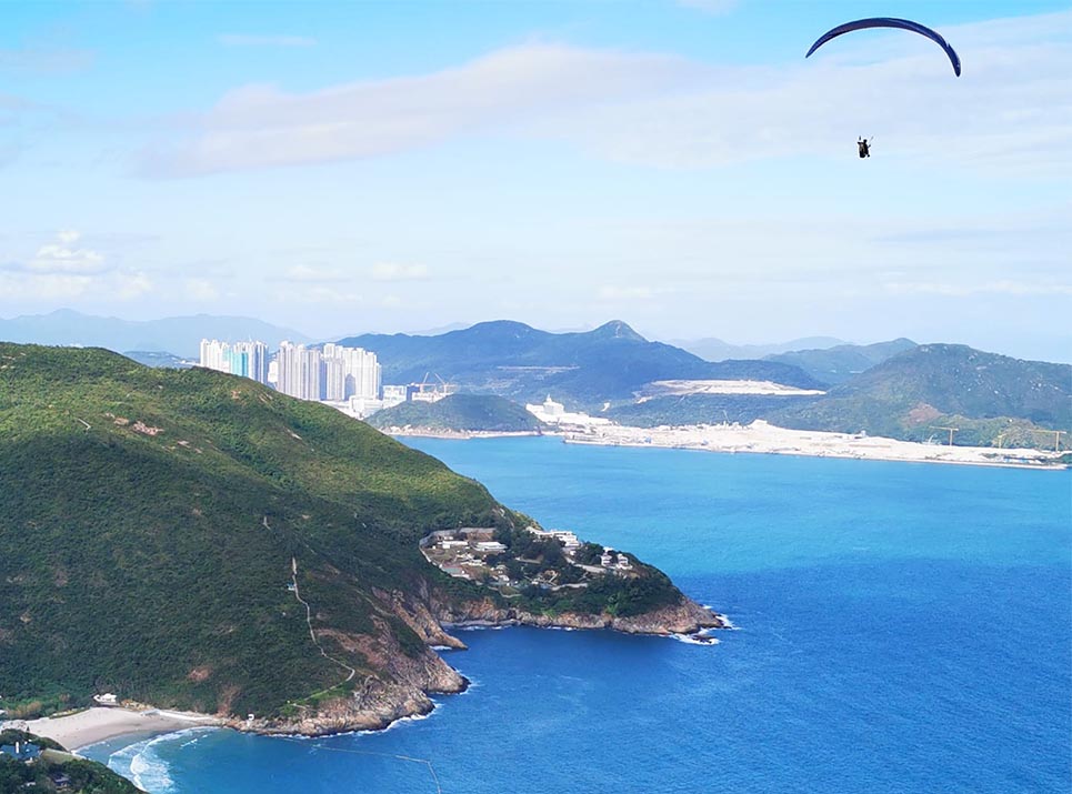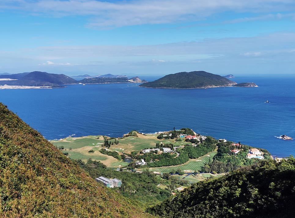 沿脊遠眺石澳、大潭道海岸風光及遠方的將軍澳、清水灣郊野公園、東龍洲。陽光明媚的天氣下,藍天白雲、青山碧海的風景線。