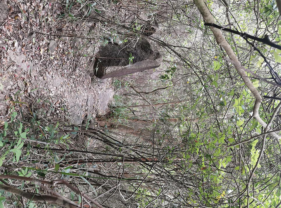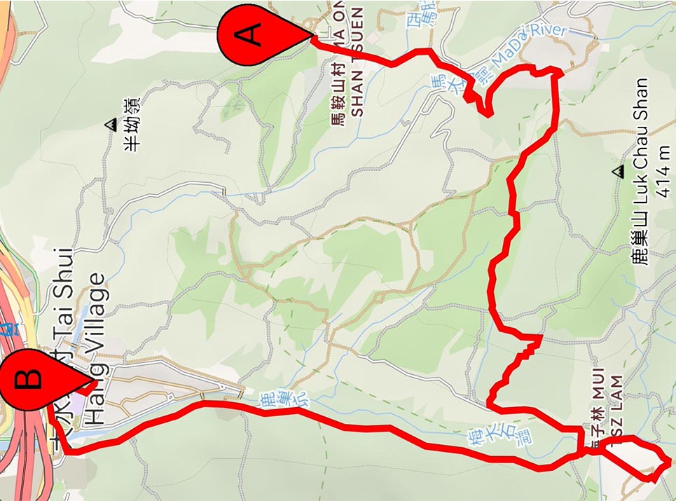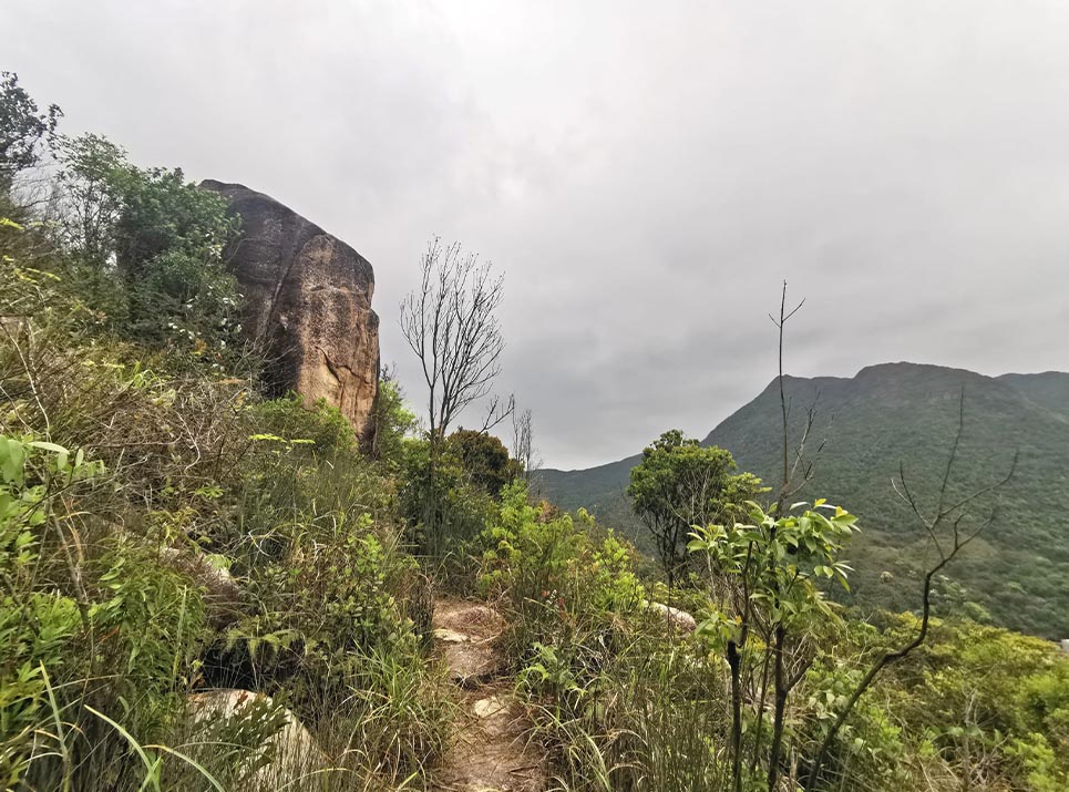 路徑多分岔路口,亦無路標指示,要小心定向。離徑穿密林山坡落梅子林,這段荒徑稍崎嶇陡斜,接村道入梅子林。