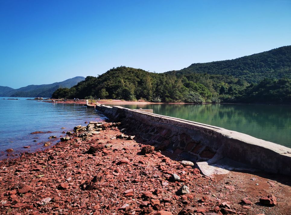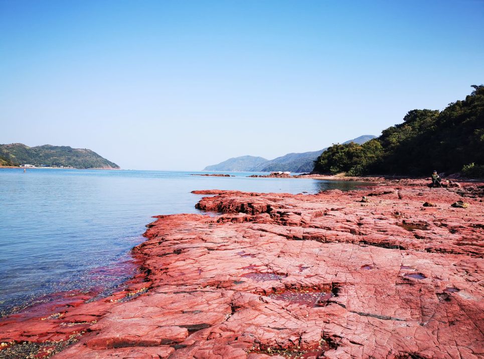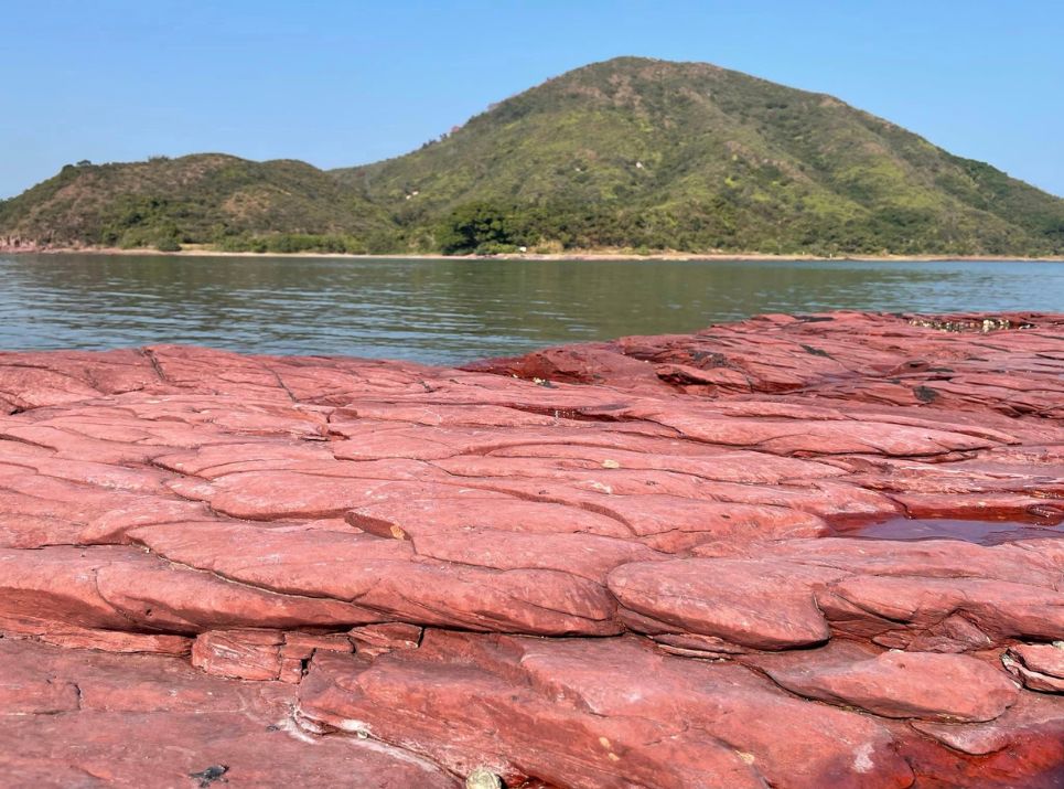 一大片揭紅色石岸,和對岸往灣洲形成的狹窄水道,在藍天白雲下,構成一幅美麗的天然美景。