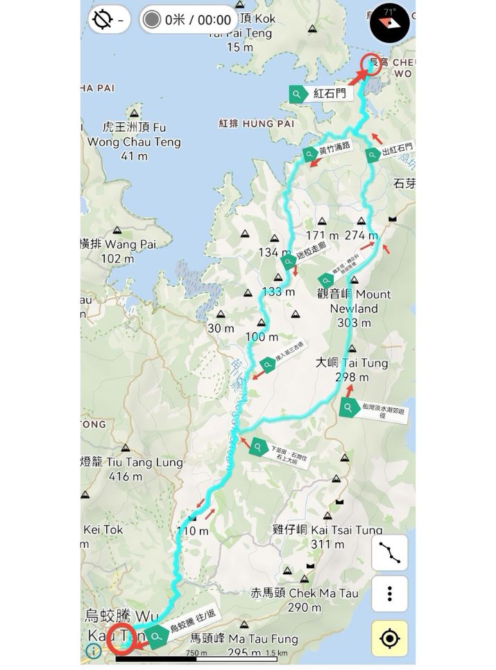 烏蛟騰起步,往下苗田石澗旁轉上大峒、過觀音峒(303m),C2611/C2612間離主徑左落企斜排荒徑,灌木樹棘,過廢村及小水塘出紅石門。