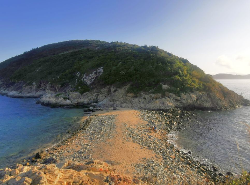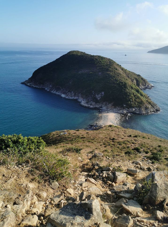 急落碎石斜坡,高處下望靚景地貌的沙洲連島。沙洲可綑邊右往女鬼手岩。